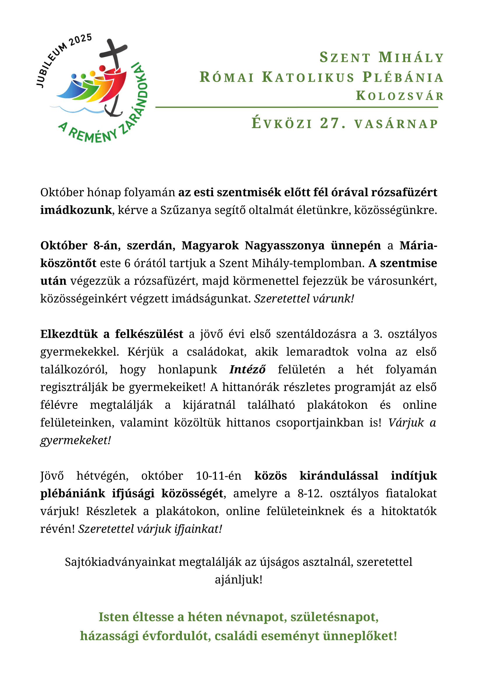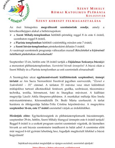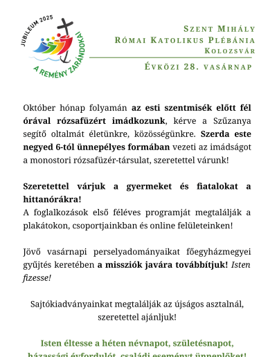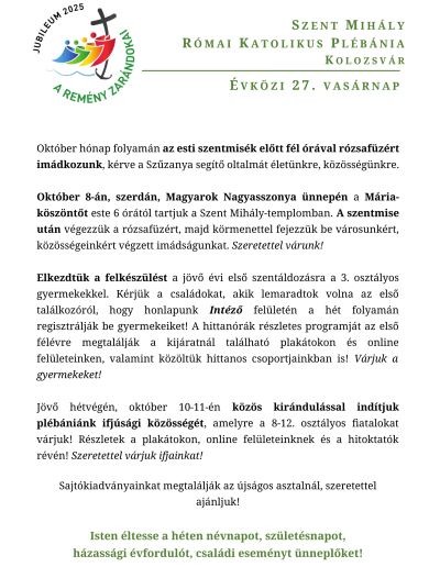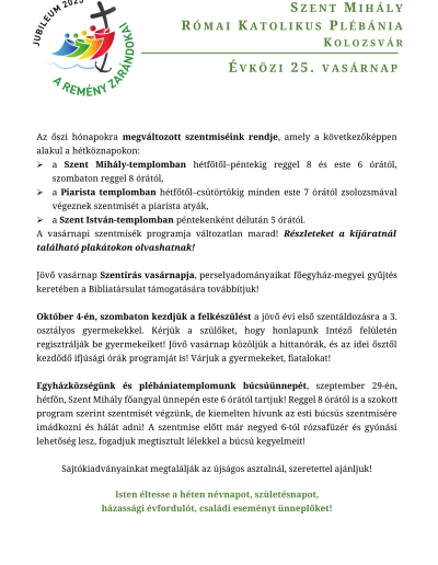 - 11Kirándulás az ifjúsági közösséggel00:00Jövő hétvégén, október 10-11-én közös kirándulással indítjuk plébániánk ifjúsági közösségét, amelyre a 8-12. osztályos fiatalokat várjuk! Részletek a plakátokon, online felületeinknek és a hitoktatók révén! Szeretettel várjuk ifjainkat! , ...