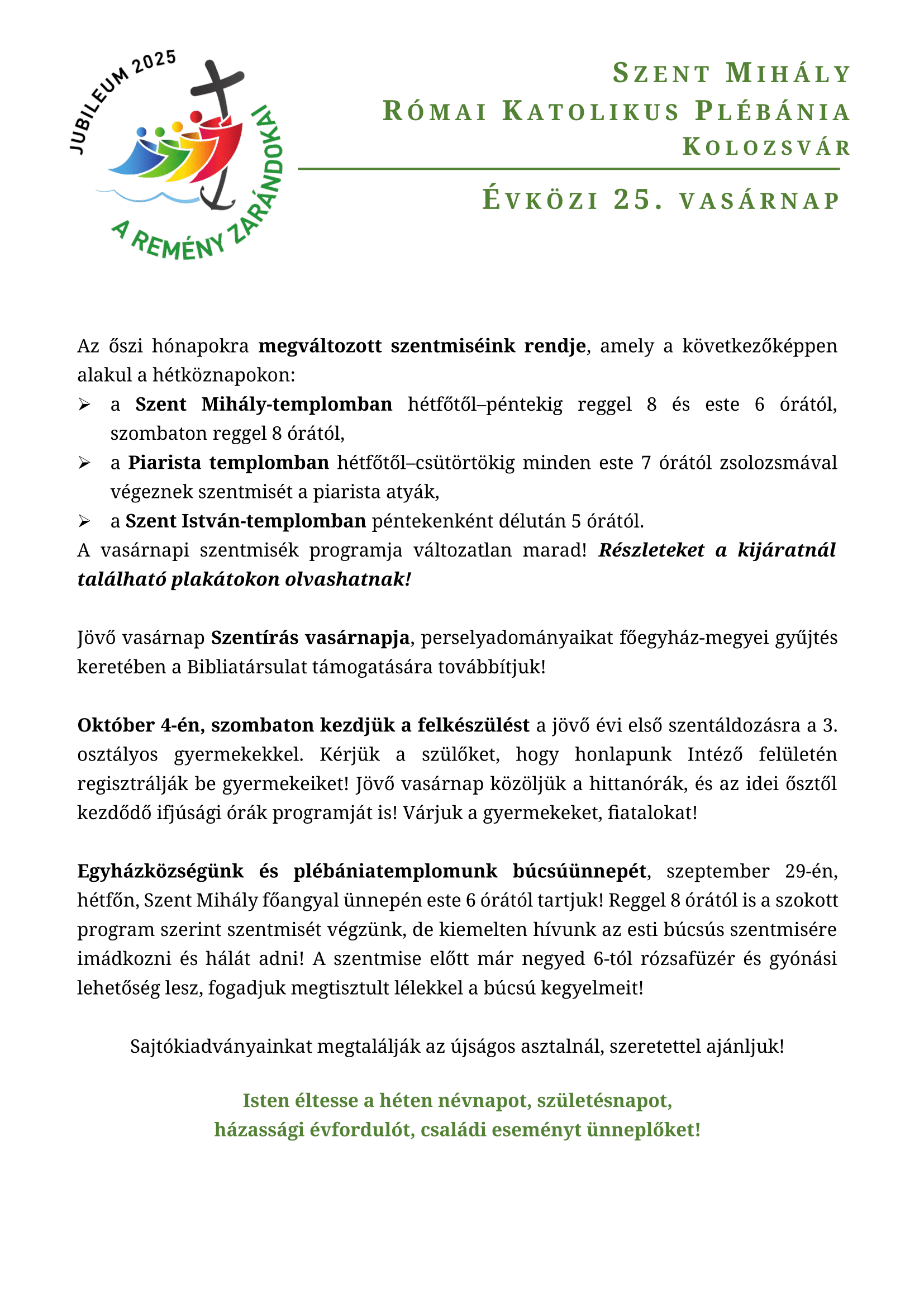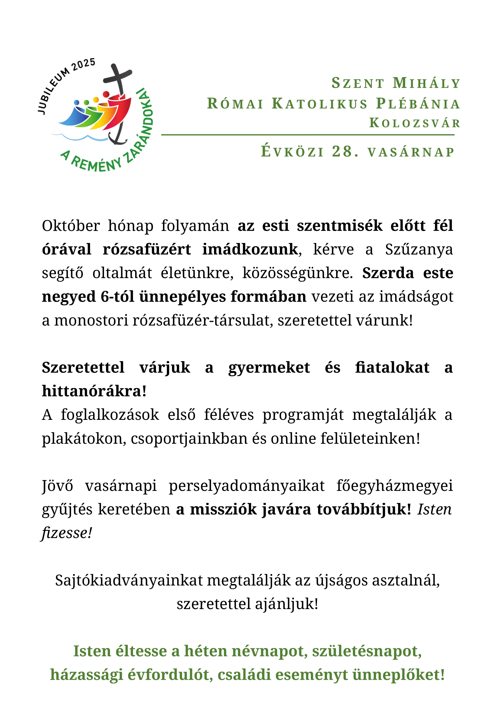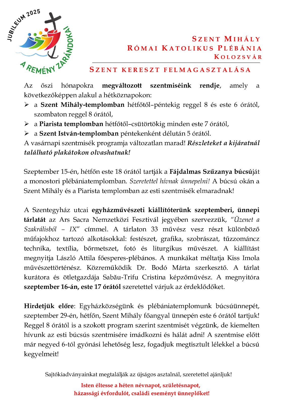 Vasárnap 9:30 órától ünneplünk szentmisét.